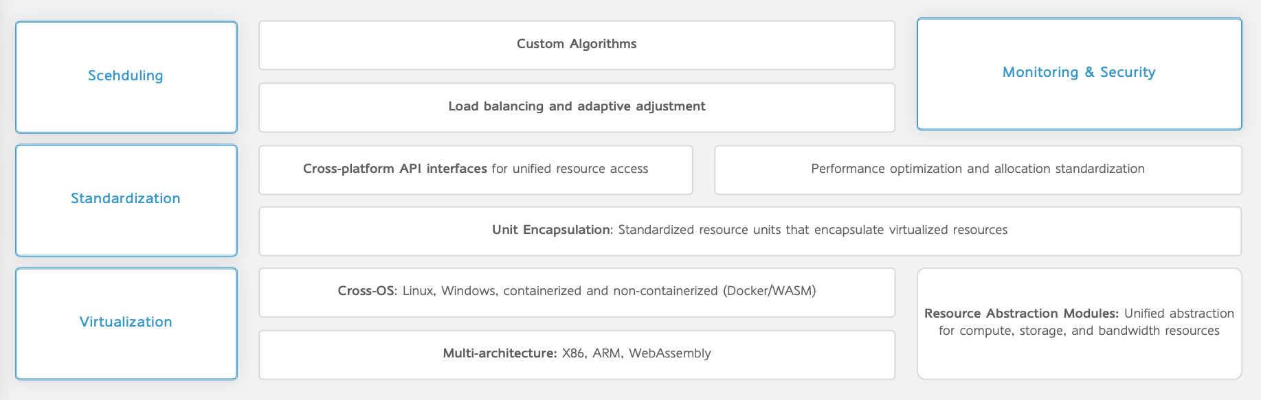 The Scheduling Layer is responsible for dynamically matching resources to user demands, ensuring efficient utilization of distributed resources. With advanced load balancing and adaptive adjustments, it can handle varying workloads in real time. Tailored scheduling algorithms are employed to coordinate the unique requirements of heterogeneous resources, enabling optimized and responsive allocation.